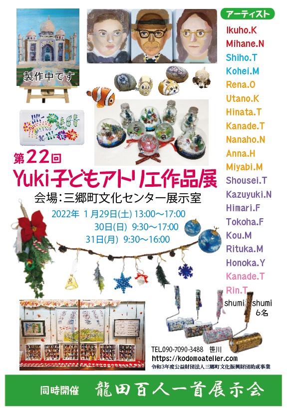 合同作品を制作することが出来なかったのですが、20名の子ども達が制作した作品を出来る限り展示しますので楽しみにお待ちください。龍田百人一首の人形やかるたも展示します。